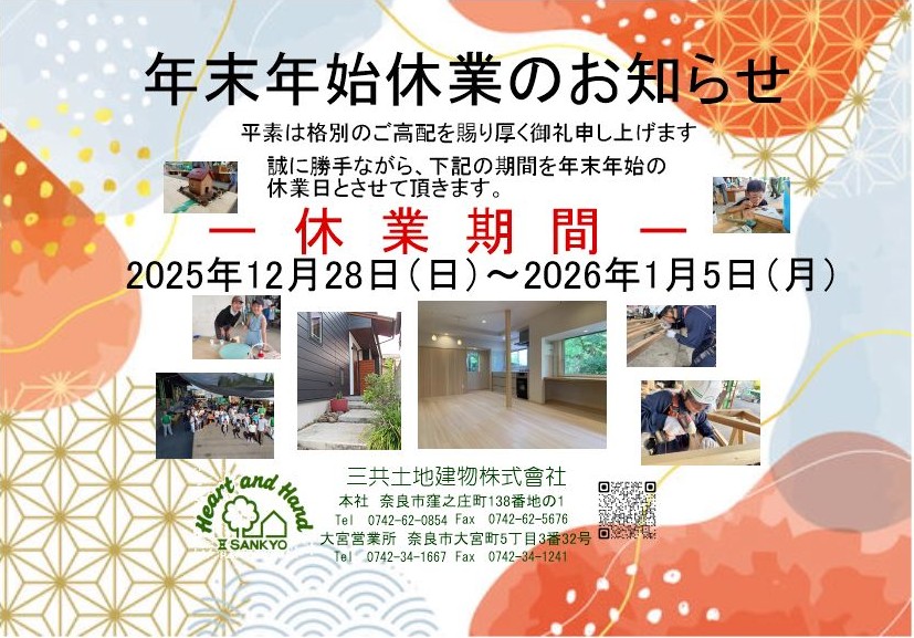 2025年12月16日 お知らせ 平素は格別のご高配を賜り、厚く御礼申し上げます。 誠に勝手ながら上記の期間を年末年始の休業日とさせて頂きます。 尚、年始は2026年1月7日(水)より通常営業致します。 期間中は大変ご不便をお掛け致しますが、何卒ご了承下さいますようお願い申し上げます。 古い記事へ 新しい記事へ 一覧に戻る